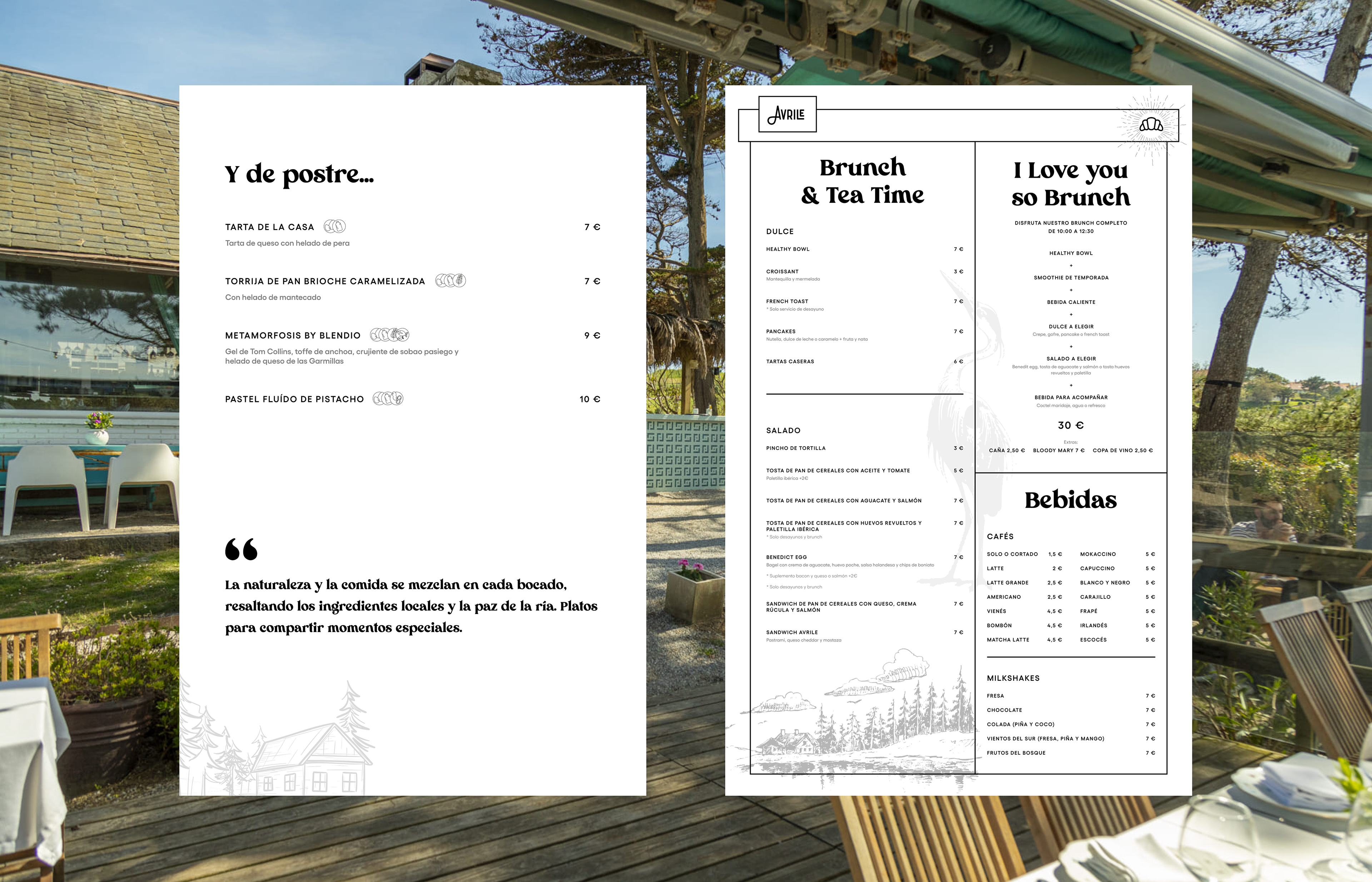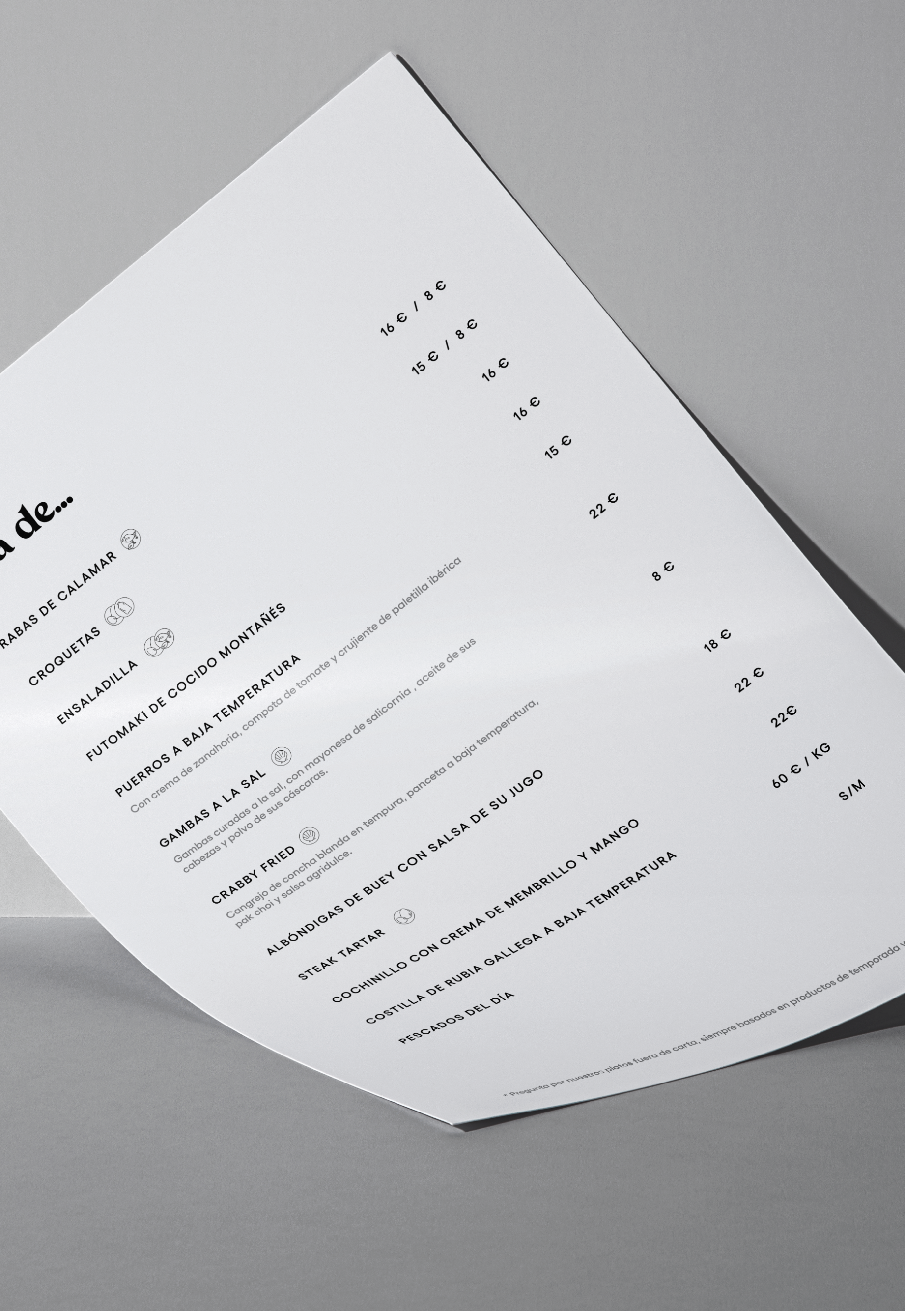 Se desarrolló una identidad basada en el minimalismo artesanal. La pieza central es una tipografía con serifa personalizada, retocada para obtener un acabado limpio y atemporal. Como complemento gráfico, se integró la figura de la garza, ave emblemática de la ría de Mogro, aportando un componente orgánico y territorial al branding. El proyecto culminó en un despliegue editorial completo, diseñando cartas y menús físicos y digitales donde la elección de materiales y el uso consciente del espacio en blanco refuerzan la experiencia sensorial del comensal.