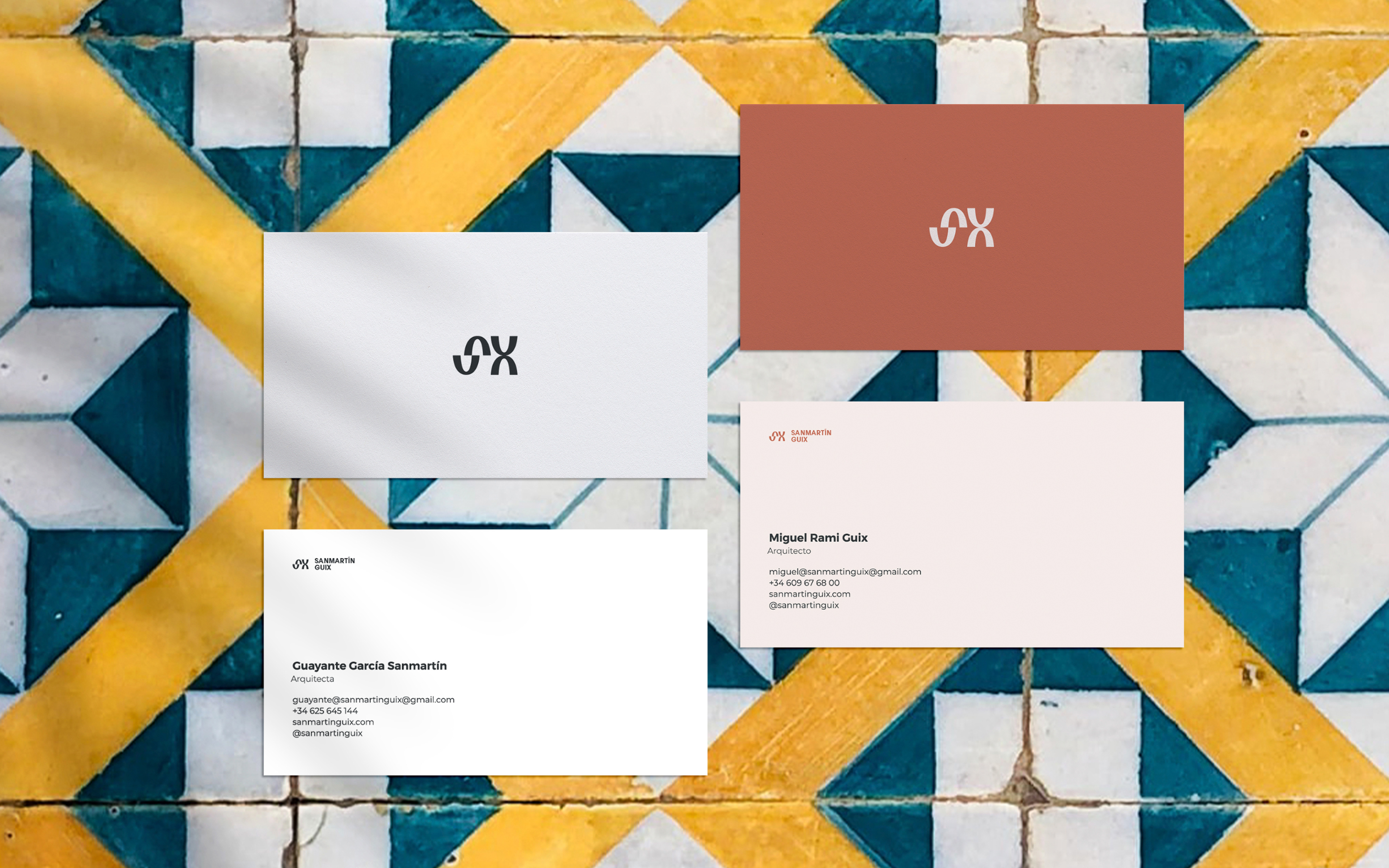 Se diseñó un sistema de marca basado en la síntesis geométrica, utilizando el arco de medio punto para configurar las letras "S" (inicio) y "X" (cierre). La paleta cromática evita los contrastes puros, optando por tonalidades que evocan los materiales de obra (cemento, tierra y ladrillo) para diferenciar las dos almas del estudio. El proyecto se expandió hacia un entorno digital diseñado bajo una retícula modular estricta, priorizando el minimalismo y la atemporalidad. Como recurso gráfico adicional, los arcos del logotipo se transforman en patrones geométricos que rinden homenaje a la baldosa ornamental, un elemento recurrente en sus proyectos, logrando una identidad coherente, táctil y profundamente vinculada a la arquitectura real.