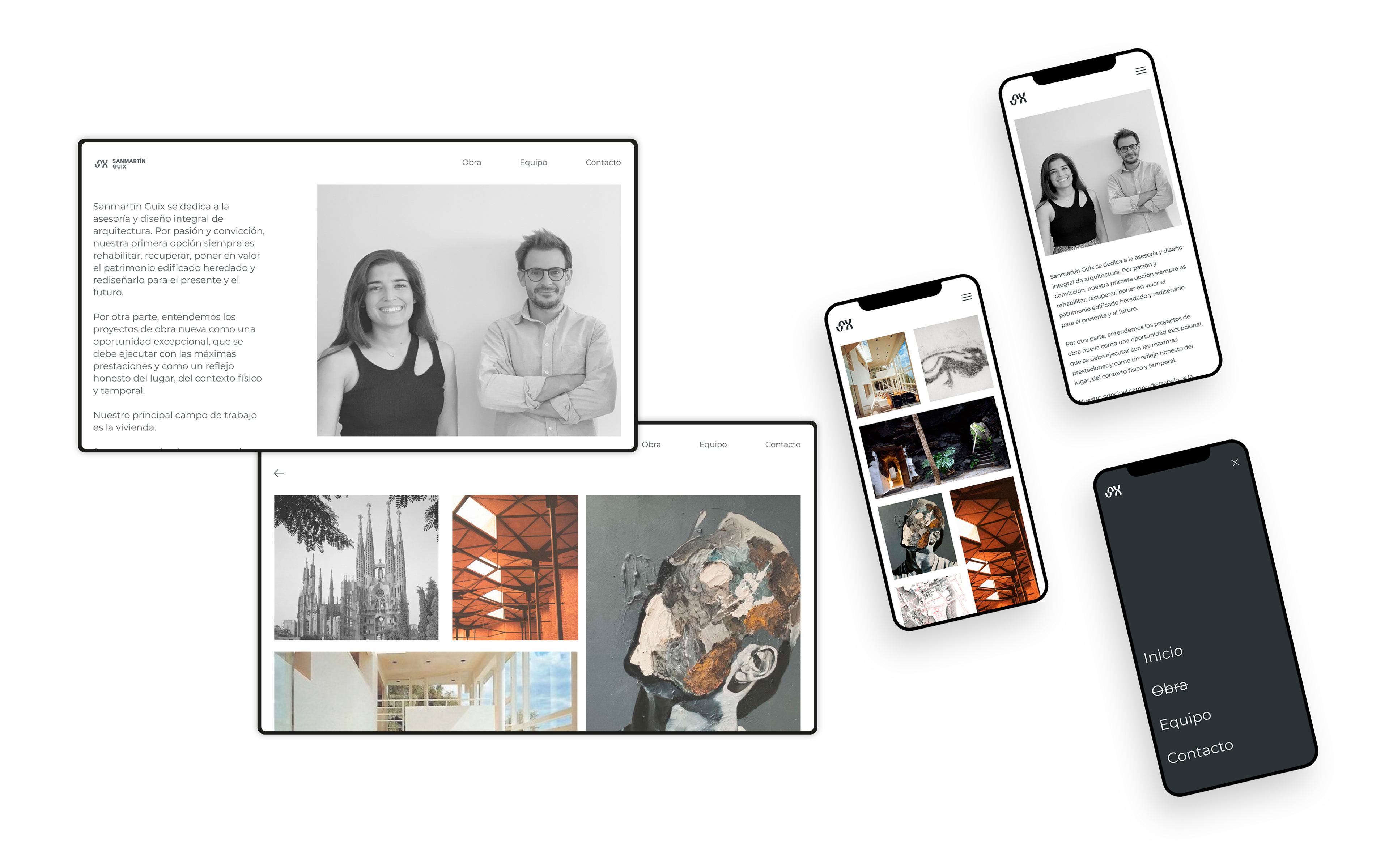 Sanmartín Guix es un estudio de arquitectura definido por su metodología de "implicación total": un acompañamiento integral desde la conceptualización hasta la ejecución final. La identidad visual se articula en torno a la geometría del arco, elemento fundacional de la arquitectura, para construir un sistema de marca que simboliza solidez, equilibrio y un compromiso absoluto con la obra terminada.